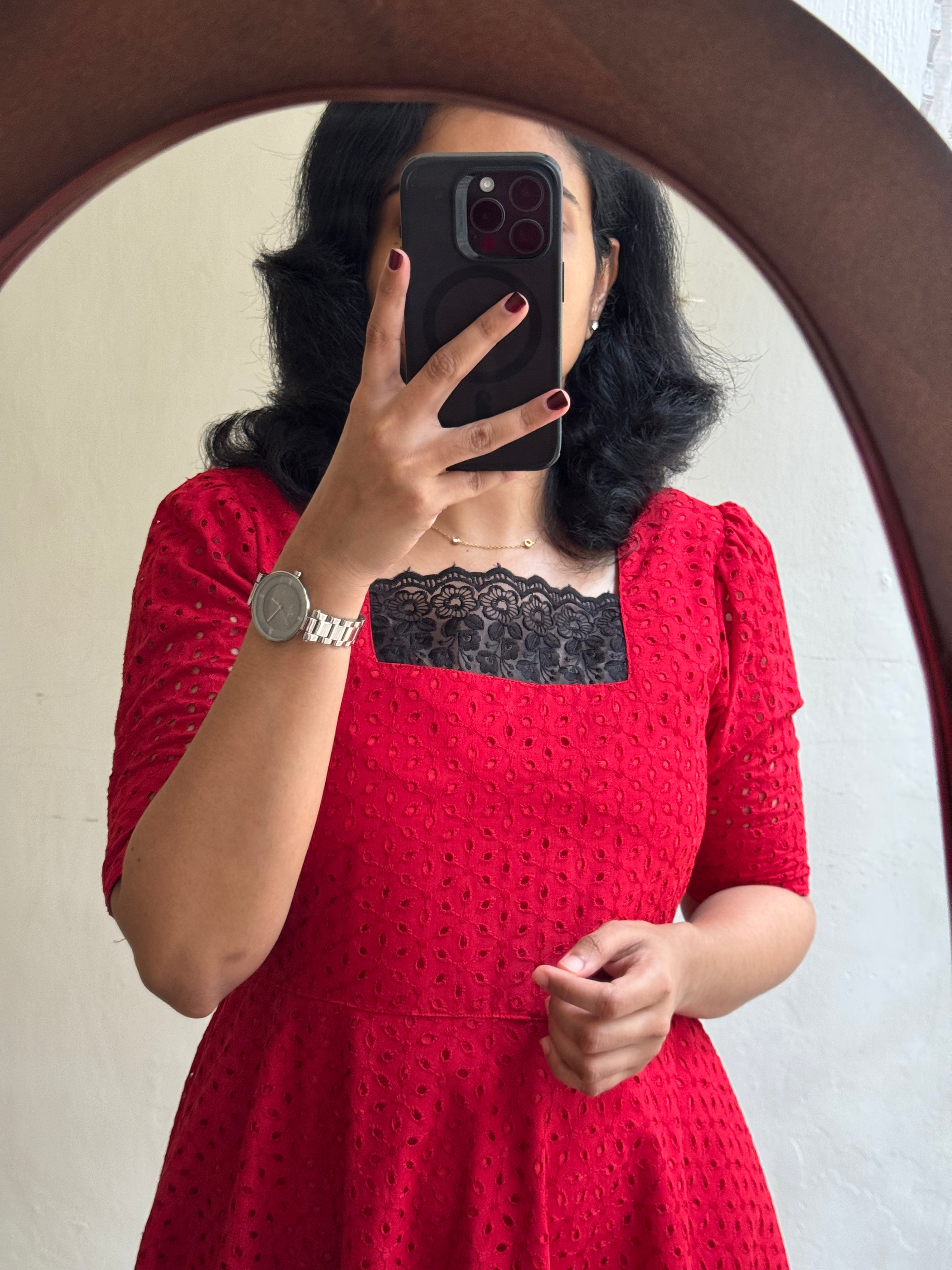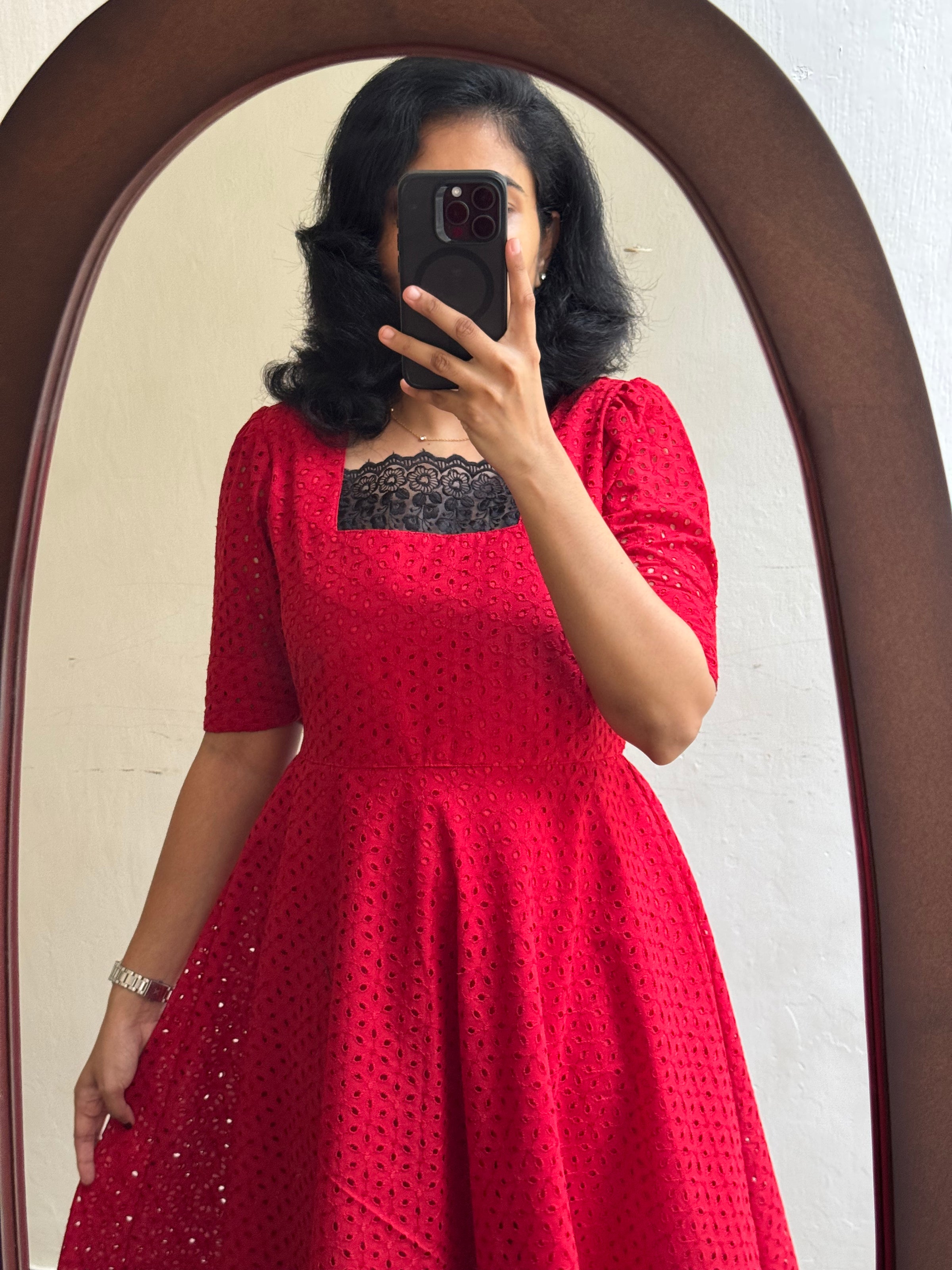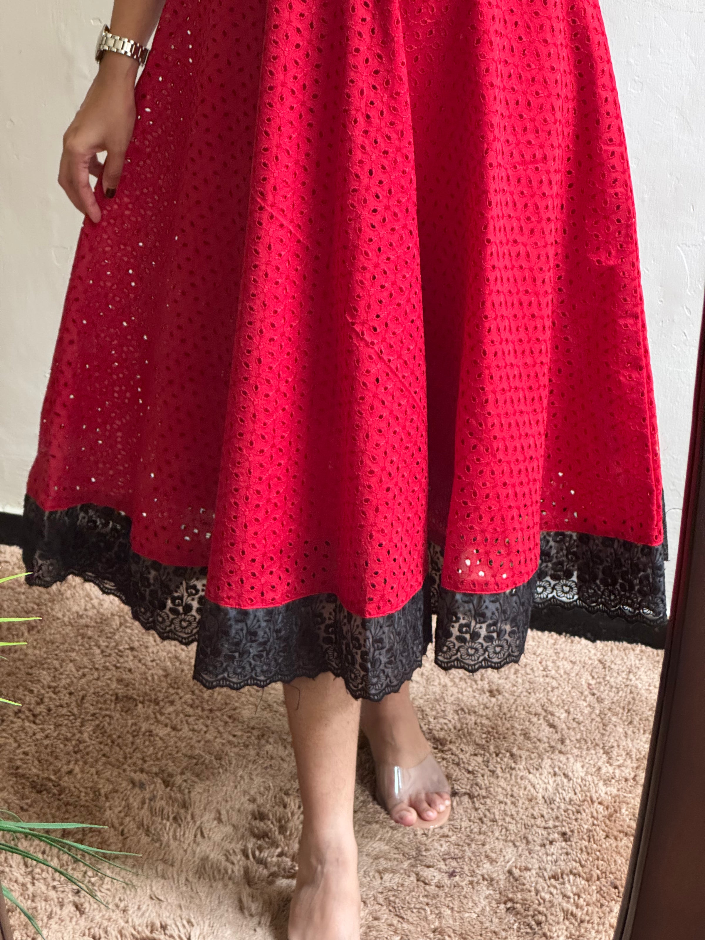 Scarletta Hakoba - Beautiful red like shade hakoba . Pure cotton material with pure FULL cotton lining !. Beautiful outfit wear on any occasion!! With delicate lace work in yoke neck and bottom of the dress to highlight the look!! Back hip knot provided!!
